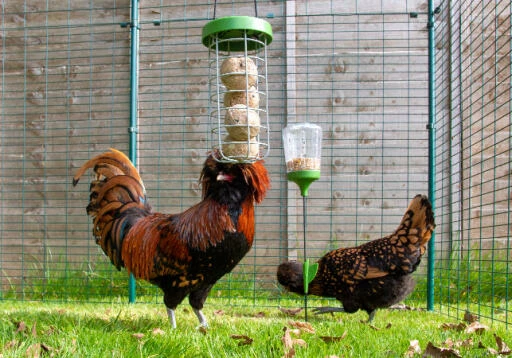 The Pendant Peck Toy can hang from a variety of heights for swinging, snacking fun! Instead of simply scattering your chickens’ scratch around on the ground, fill the Pendant Peck Toy with your hens’ favorite scratch grains and watch them go to town!
